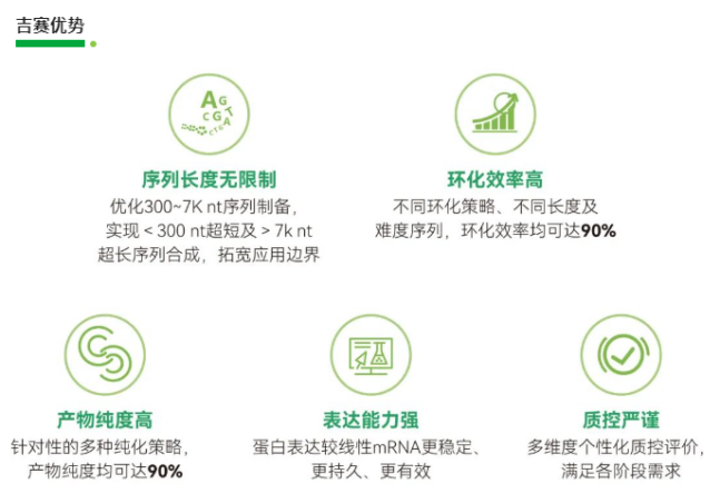 吉赛生物拥有RNA环化专利技术,分别为基于I型内含子自剪接法circPrecise®和基于T4连接酶法的circPure®,可实现精准高效的circRNA体外环化。此外,吉赛生物通过分析IVT circRNA产物杂质组分和含量,采用多种针对性层析纯化策略;再使用RNase R辅助纯化,所用的RNase R为吉赛生物自主研发,经过优化的RNase R消化能力更强、效率更高、综合性能更佳,用于IVT circRNA产物纯化可降本增效。