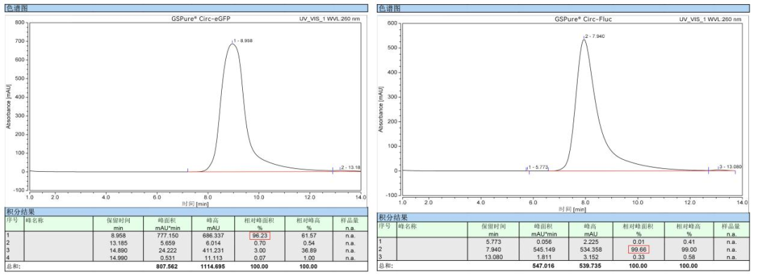 中国食品药品检定研究院徐苗团队建立RT-HPLC纯化法,明显分离circRNA、nicked RNA和precusorRNA,用于分析circRNA疫苗纯度及降解产物。