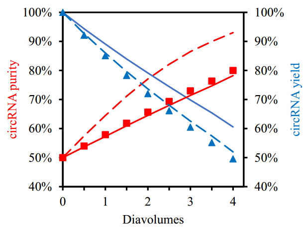 研究使用用分子量从30到300 kDa的聚醚砜(PES)膜测量了circRNA、线性preRNA和nicked RNA的筛分系数(一种分离度量),分析了渗透通量的函数性能,估计了RNA的临界通量,并确定了合适的纯化操作条件。研究突出了超滤在研究规模上是一种优越的circRNA纯化方法,也可以在基于circRNA的治疗药物的大规模生产中发挥关键作用。