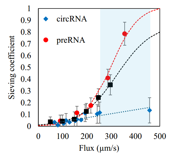 虽然临界通量之间的差异很小,但在较高通量值下,circRNA的筛选系数明显低于preRNA和nicked RNA的筛选系数。circRNA的低筛分系数接近恒定,这可能是由于膜中孔径的分布,而不是由于流动引起的变形,其中一小部分circRNA分子可以通过其中较大的孔。