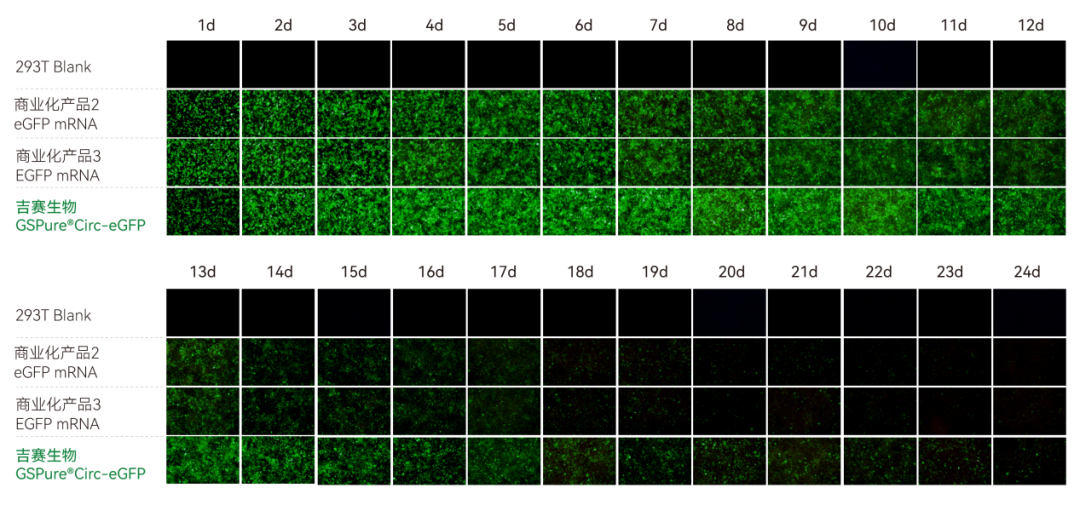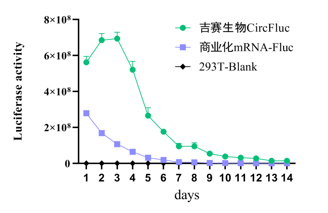 相比线性mRNA,GSPure®Circ-eGFP转染细胞后的荧光表达明显更强、持续时间明显更长;GSPure®Circ-Fluc转染细胞后表达的荧光素酶活性明显优于线性mRNA。