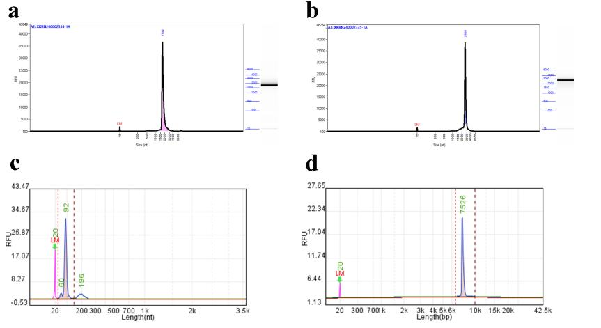 Agilent 5400分别检测纯化后circ-eGFP(a)和circ-Fluc(b)的环化产物,以及Qsep 100检测纯化后较短(<300nt)序列(c)和较长(>7k nt)序列(d)环化产物完整性均为90%以上。