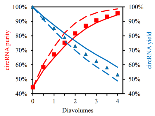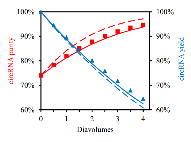 研究对IVT产物溶液,进行四次超滤,获得circRNA纯度为81%,产率为65%(图9)。通量由334µm/s降至258µm/s。所获得的纯度不如三元混合物的分离,这可能与内含子、残留核苷酸和DNA模板等杂质有关。