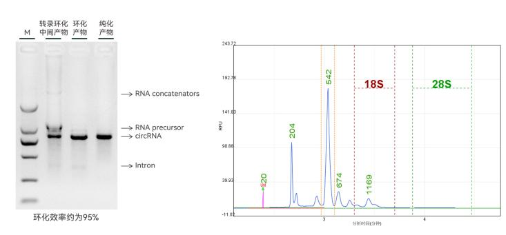 琼脂糖凝胶电泳(左)以及Qsep 100(右)检测产物的环化效率均为90%以上。