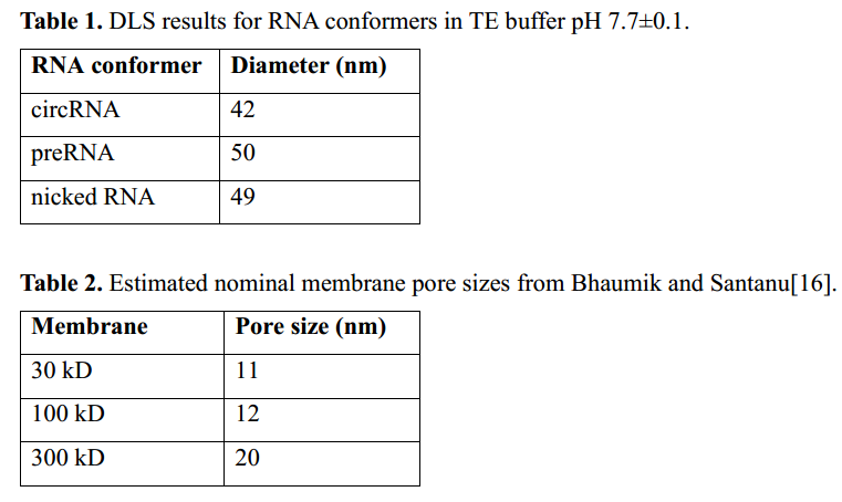 因此,为了选择合适的膜,研究测量了RNA的动态光散射(DLS)值,即RNA分子为球形时的水动力直径(表1)。假设RNA分子以完全伸展的形状流过膜,因此研究选择截留分子量(MWCOs)小于所有RNA构象的动态直径的膜。(表2)