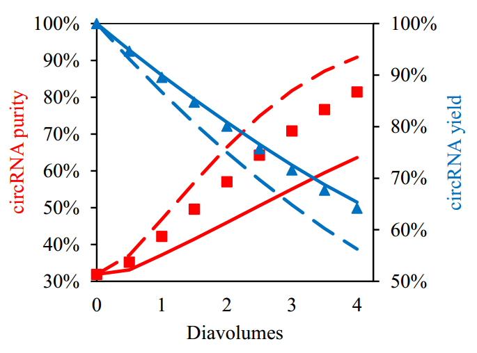 研究探索了超滤法作为circRNA的替代纯化方法,并获得了比SE-HPLC更高的纯度和产率,纯度约为SE-HPLC的两倍,得率在50%以上。此外,相对容易的超滤过程的缩放,使其有望成为工程化circRNA纯化方法。需要克服的挑战是,mAU留存时间(min)由于膜污染和浓度极化引起的通量下降,导致的运行过程中筛分系数变化。该研究的结果可能会提高基于circRNA的医学治疗和疫苗的可及性。
