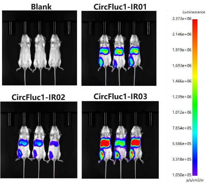 肌肉注射LNP包封的Circ-Fluc至Bal/bc小鼠,6h后活体荧光检测结果(Circ-Fluc经最佳密码子序列优化,且含不同IRES序列)