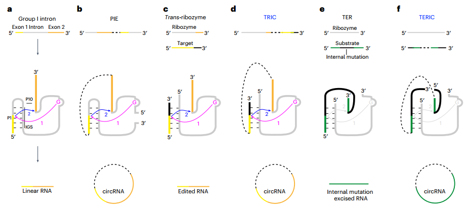I型内含子可作为反式核酶,当目标序列连接到核酶的3 ‘端,就会发生剪接反应产生circRNA。这种TRIC方法使完整的核酶保持在目标序列的上游,从而允许整个核酶的有效局部折叠。