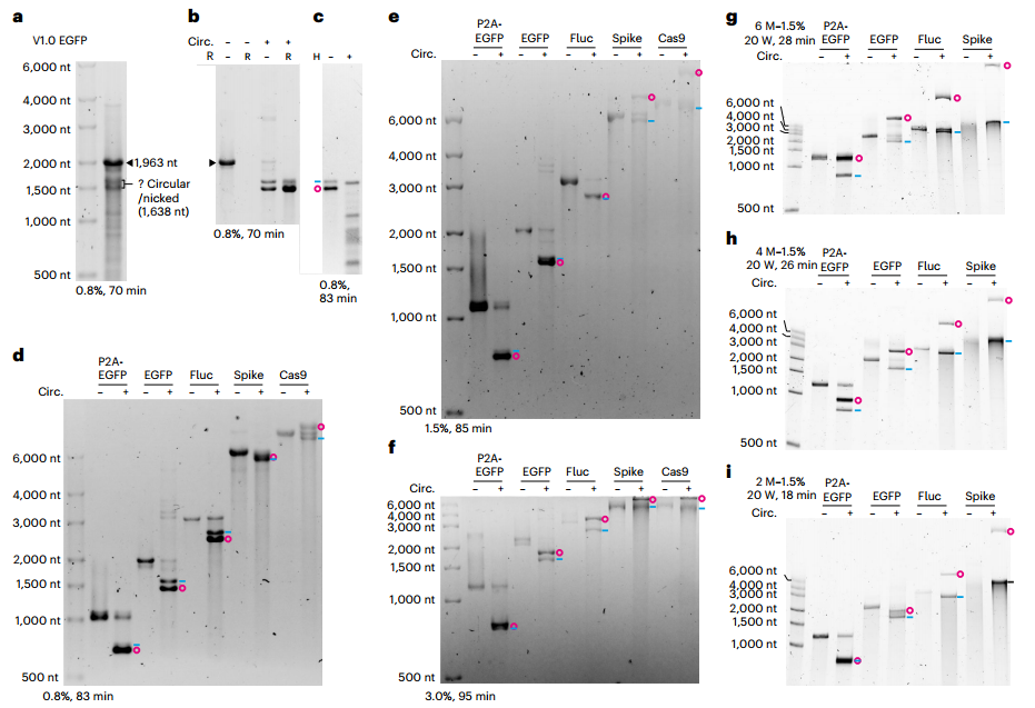 在6 M-1.5%的尿素-琼脂糖凝胶中,所有测试的circRNA的迁移速度都比线性对应物慢得多(图3g)。降低尿素或琼脂糖浓度减少了分离(图3h,i)。运行时间延长或增加运行功率可以增强分离效果。此凝胶的电泳只需要<30分钟,可成为circRNA鉴定的快速方法。