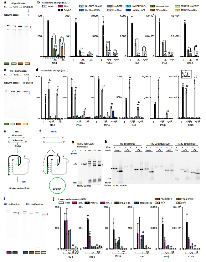 TRIC-V2构建体合成circRNA,然后通过连续三次HPLC纯化和RNase R消化。合成的circRNA免疫原性显著低于未修饰的mRNA,低于或相当于PIE法合成的circRNA。TRIC不依赖于细菌序列,这有助于合成天然环状RNA,相比含有残留序列的PIE法,避免引入细菌序列可能引发的免疫原性。(图6)