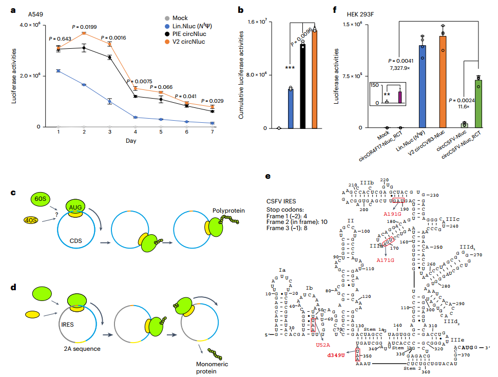 缺乏终止密码子的circRNA允许核糖体沿circRNA翻译多次,从而产生多聚蛋白,这一过程称为滚动环翻译(RCT)。多聚蛋白可被蛋白酶或自切割序列,在单轮起始中产生多个GOI拷贝。RCT的效率可以是单次翻译的100倍。研究选择CSFV IRES,并设计阅读框构建RCT。与单次翻译相比,circNluc的表达增加了10倍以上,且比使用OR4F17 IRES的RCT效率高出7,000倍以上。(图7)