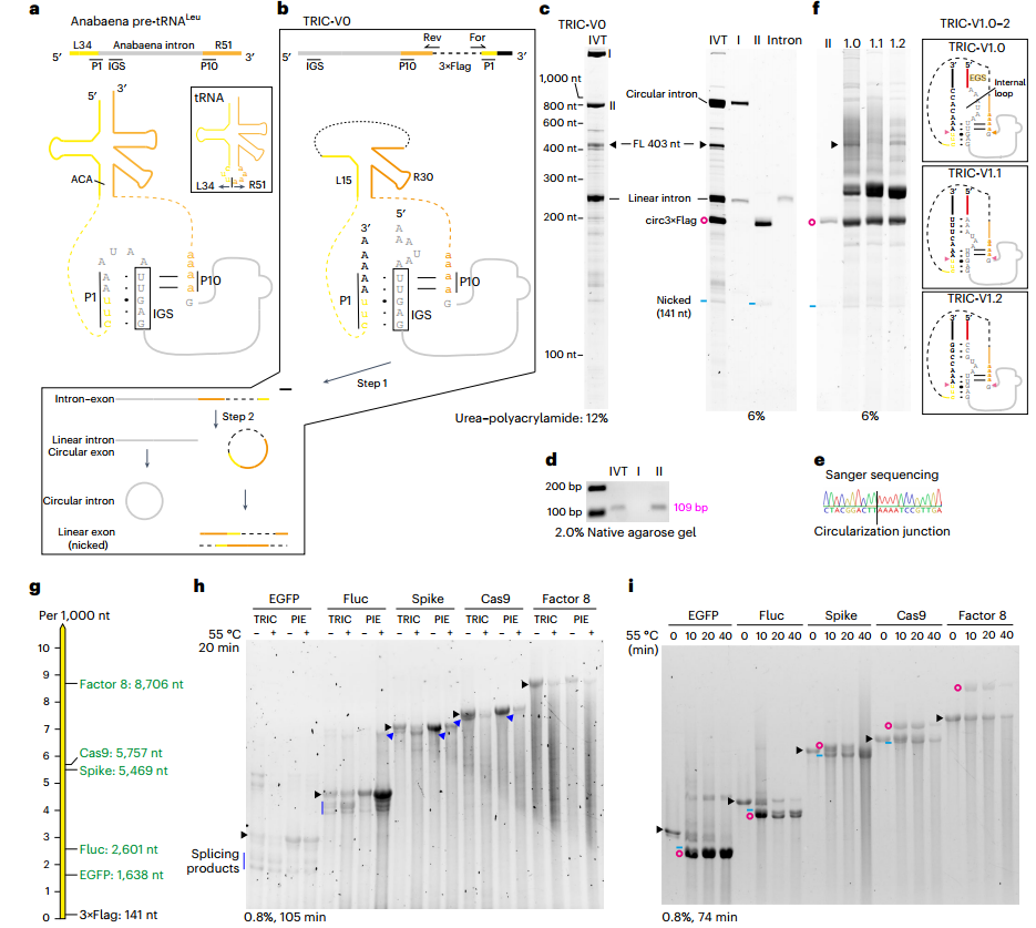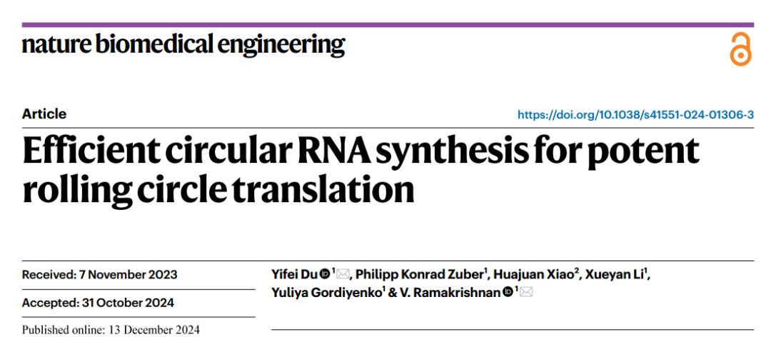 2024年12月13日,英国MRC分子生物学实验室(MRC-LMB)Venki Ramakrishnan(2009年诺贝尔化学奖得主)团队在Nature Biomedical Engineering发表研究论文:Efficient circular RNA synthesis for potent rolling circle translation。研究开发了另一种基于反式核酶的环化方法(TRIC)。