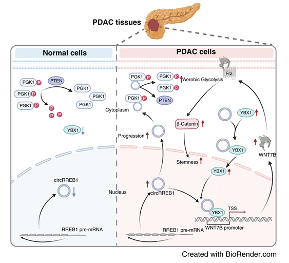 胰腺导管腺癌(PDAC)是一种高度致命的肿瘤,治疗选择有限,患者生存率低。环状 RNA(circRNA)在包括 PDAC 在内的各种癌症的发生和发展中起着至关重要的调节作用。在这项研究中,通过对不同的 PDAC 样本进行 circRNA 测序,该研究团队确定 circRREB1 是一种致癌性 circRNA,在 PDAC 中显著上调,并且与患者不良预后相关。在功能上,circRREB1 的缺失显著抑制糖酵解和干性,而升高的 circRREB1 则产生相反的效果。从机制上讲,circRREB1 与 PGK1 相互作用,破坏 PTEN 与 PGK1 之间的关联,并增加 PGK1 磷酸化以激活糖酵解通量。此外,circRREB1 通过直接与 YBX1 相互作用并促进其核易位来促进 WNT7B 转录,从而激活 Wnt/β- 连环蛋白信号通路以维持 PDAC 干性。总体而言,这些结果突出了 circRREB1 作为 PDAC 代谢和干性特性的关键调节因子。重要性:CircRREB1 刺激 PGK1 诱导糖酵解,并激活 Wnt/β- 连环蛋白信号通路以维持胰腺癌中的干性,表明 circRREB1 作为生物标志物和治疗靶点的潜力。
