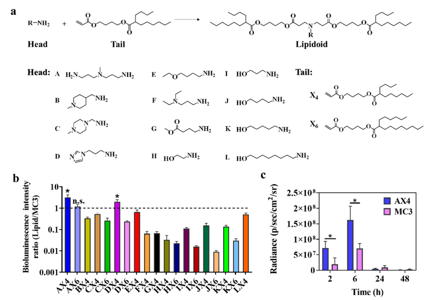 ① AX4脂质具有4个支尾和8个酯键,有利于内体逃逸和mRNA释放,最终降解LNP;