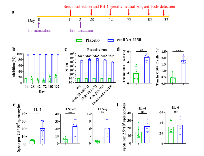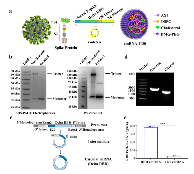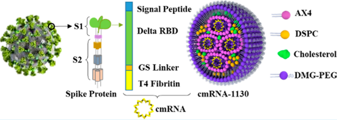 研究开发了一种新的mRNA疫苗(cmRNA-1130),由一种新的可生物降解的AX4-LNP和cmRNA编码Delta RBD三聚体形成,用于对抗SARS-CoV-2 Delta变体。