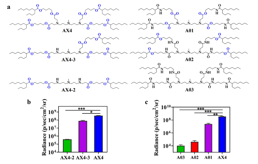 研究通过Michael加成反应合成一系列具有多个酯键的可电离脂质,利用1H NMR光谱验证结构。将这些可电离脂质与辅助脂质、胆固醇、DSC和DMG-PEG一起配制成LNP,并保持与商用Dlin-MC3-DMA脂质(MC3)相同的摩尔组成和氮磷比(N/P)进行RNA包封。其中,AX4-LNP与商业化ALC0315-LNP和SM102-LNP相比,在IM给药后诱导的蛋白表达相似,展现最有效的mRNA递送效果。(图1)