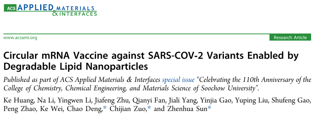 2025年1月9日,苏州大学联合苏州科锐迈德生物医药科技有限公司研究团队在ACS Appl Mater Interfaces上发表研究论文:Circular mRNA Vaccine against SARS-COV-2 Variants Enabled by Degradable Lipid Nanoparticles。