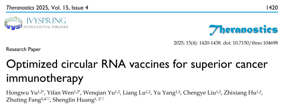 近日,复旦大学黄胜林联合福建省肿瘤医院方主亭研究团队在Theranostics期刊上发表论文:Optimized circular RNA vaccines for superior cancer immunotherapy。