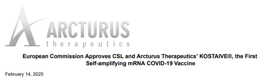 2025年2月14日,生物技术公司CSL与自复制mRNA先驱Arcturus Therapeutics共同宣布,欧盟委员会(EC)已授予自复制mRNA COVID-19疫苗KOSTAIVE®(ARCT-154)的上市许可,用于18岁及以上的成年人。KOSTAIVE®是第一个获得欧盟委员会批准的sa-mRNA COVID-19疫苗,也是全球首款获批上市的自复制mRNA疫苗。KOSTAIVE本次获批的上市销售授权在所有欧盟成员国和EEA(欧洲经济区)国家均有效。