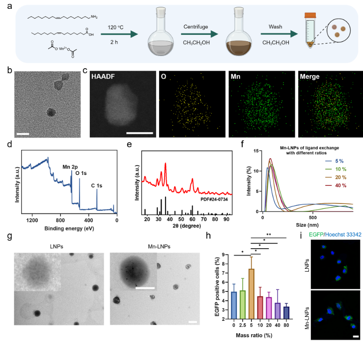 研究通过水热反应,用乙酸锰作为前体合成Mn3O4 NPs。透射电子显微镜(TEM)显示,Mn3O4 NPs呈球形,平均尺寸为7.6 nm。通过调整mPEG3-COOH的配体交换比例,实现了Mn3O4纳米颗粒在LNPs中的成功掺入,最佳比例为40%。透射电镜(TEM)图像显示Mn-LNPs的结构完整,平均尺寸为71.5 nm,与LNP相比具有更低的zeta点位。