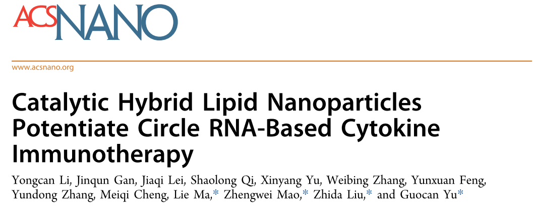 近日,清华大学喻国灿、山西高等创新研究院刘志达、浙江大学毛峥伟等人研究团队在ACS Nano期刊上发表研究论文:Catalytic Hybrid Lipid Nanoparticles Potentiate Circle RNA-Based Cytokine Immunotherapy。