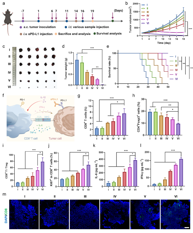Mn-LNP递送编码IL-12的环状RNA联合αPD-L1治疗(I:PBS,II:αPD-L1,III:LNPs@RNAIL-12,IV:LNPs@RNAIL-12 +αPD-L1,V:Mn-LNPs@RNAIL-12,VI:Mn-LNPs@ RNAIL-12 +αPD-L1)