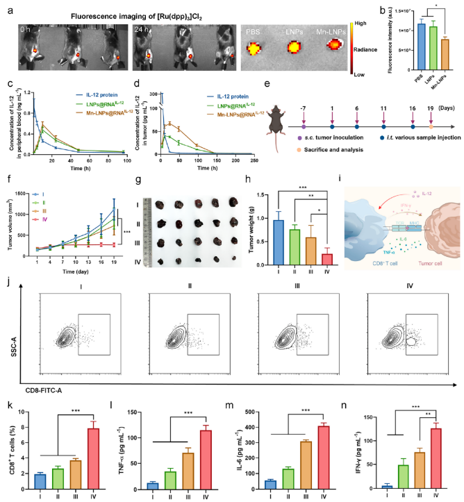 Mn-LNP促进circRNA肿瘤免疫治疗(I:PBS,II:Mn-LNPs,III:LNPs@RNAIL-12,IV:Mn-LNPs@RNAIL-12)