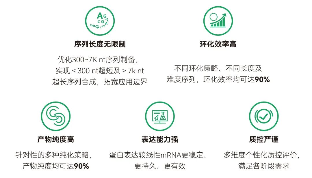 吉赛生物拥有基于PIE法的专利环化技术circPrecise®,可高效合成超短序列的环状RNA,且产物完整性高、纯度高,有利于降低免疫原性。此外,吉赛提供RNA二级结构模拟、序列设计、LNP包封等服务,以及一系列RNA现货产品,包括多种天然环状RNA,加速环状RNA适配体从设计到临床应用的转化进程。