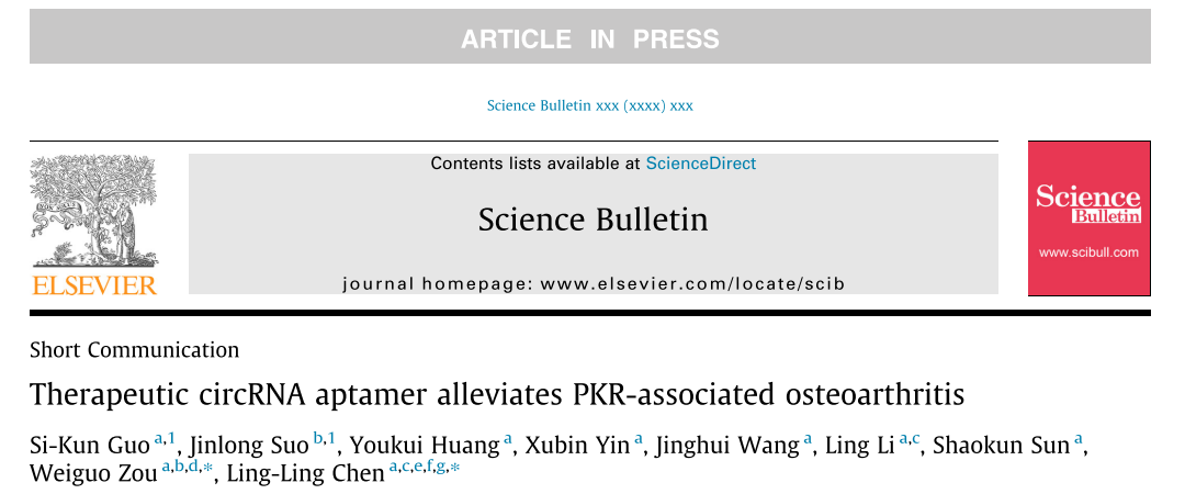 近日,陈玲玲团队和邹卫国团队,在《科学通报》(Science Bulletin)发表了新的研究成果:Therapeutic circRNA aptamer alleviates PKR-associated osteoarthritis。该研究开发ds-cRNA适配体作为PKR抑制剂治疗骨关节炎的策略,并进一步验证了LNP递送ds-cRNA可有效治疗OA小鼠模型。