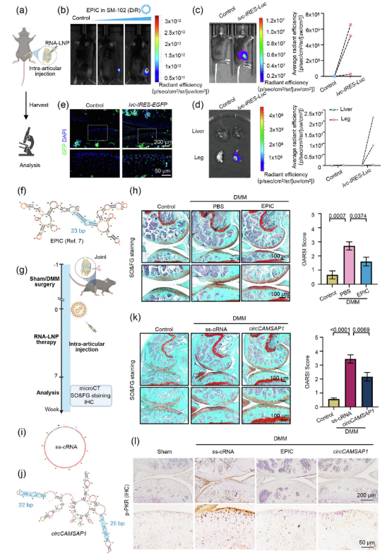 研究利用此前设计的ds-cRNA(EPIC)[2],通过SM-102脂质纳米颗粒(LNP)包封后,关节内注射至内侧半月板胫骨韧带失稳术(DMM)模型小鼠体内。结果显示,EPIC-LNP可有效保护关节,减轻OA病变,且未引发明显的炎症反应,表明ds-cRNA治疗OA策略具有有效、稳定及安全性。