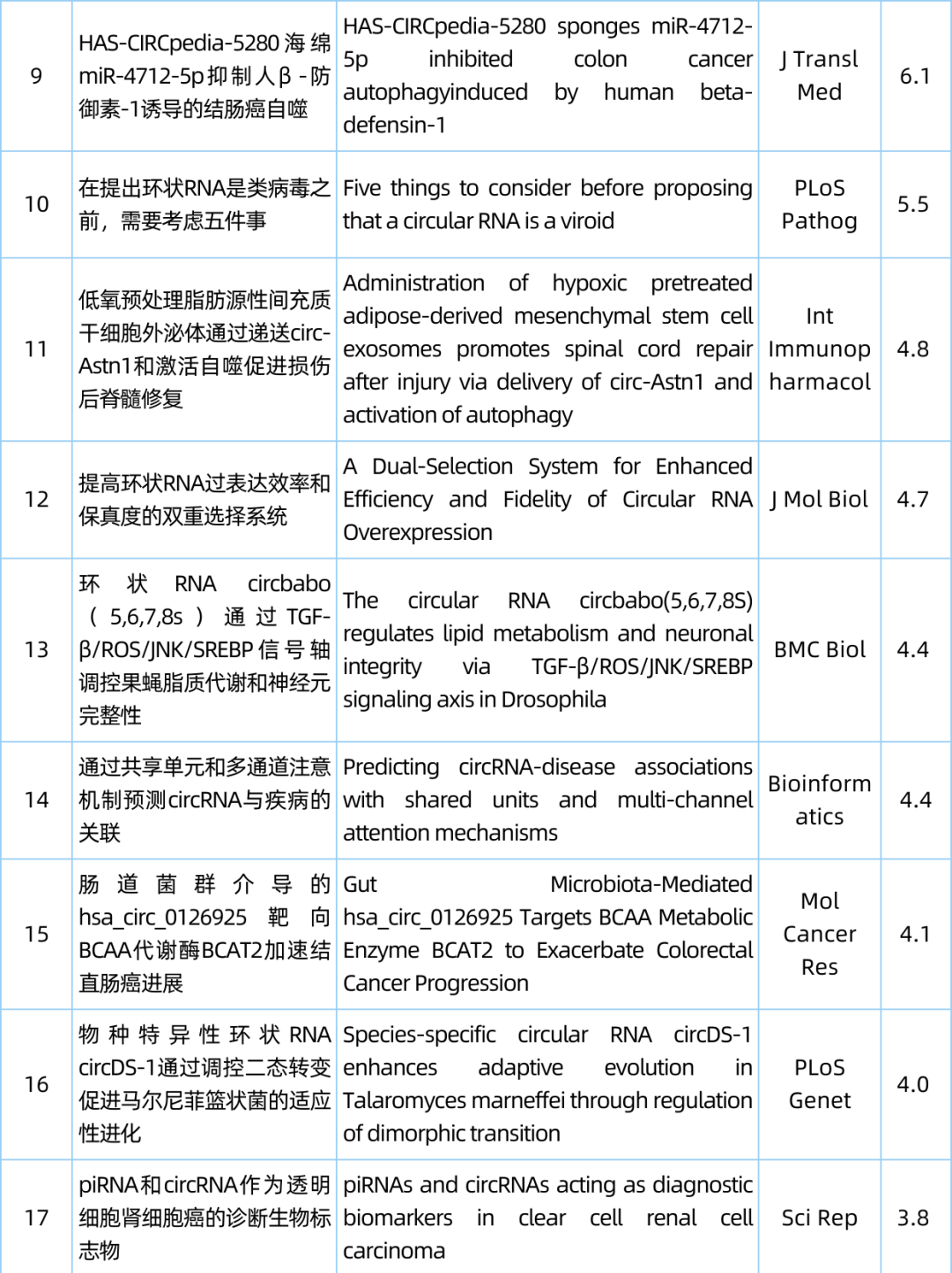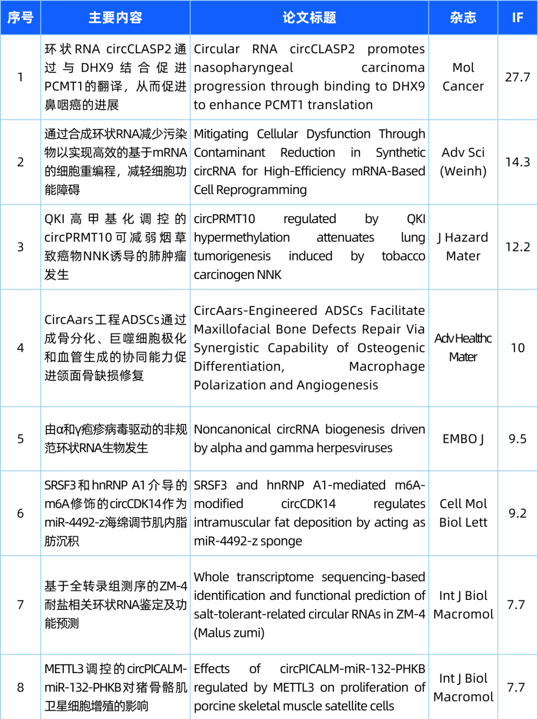 欢迎来到“circRNA研究汇总”栏目,本栏目将为您带来circRNA领域的最新研究成果。本期我们精选了25篇最新文献,涵盖了circRNA的基础研究、功能探究以及与疾病的关联。请您紧跟circRNA研究的步伐,共同洞悉科研前沿的最新动态! 检索式:(circRNA[Title/Abstract]) OR (circular RNA[Title/Abstract]) OR (circular mRNA[Title/Abstract]) 研究汇总列表 素材来源官方媒体/网络新闻。 分类: circRNA与疾病, 前沿动态, 最新重要进展, 每周进展汇总, 研究热点跟踪admin三月 11, 2025评论