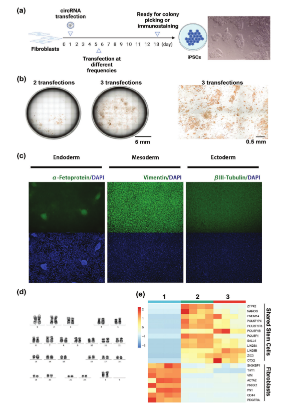 利用该新策略纯化的circRNA在诱导多能干细胞(iPSC)重编程中表现出优异的性能,仅用三次OSKMLN circRNA转染处理即可实现超过300%的重编程效率。