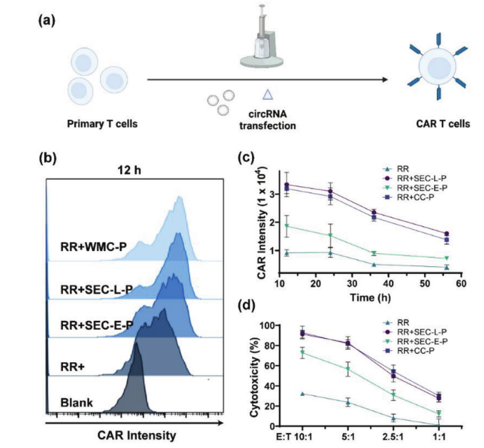 此外,在对肿瘤细胞具有高细胞毒性的T细胞中,纯化的circRNA实现了嵌合抗原受体(CAR)的高水平和持续表达,使其成为有前景的基于mRNA的CAR-T治疗策略。