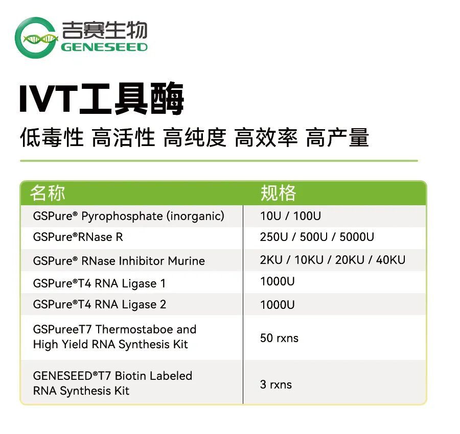 研究通过构建含目标基因、T7启动子、IRES、PIE构建体和间隔序列的质粒,线性化质粒并扩增后,通过T7酶体外转录合成环状RNA。类似地,吉赛生物可提供体外合成的一系列工具酶,助力高效的体外转录和circRNA合成,加速RNA创新疗法研发。