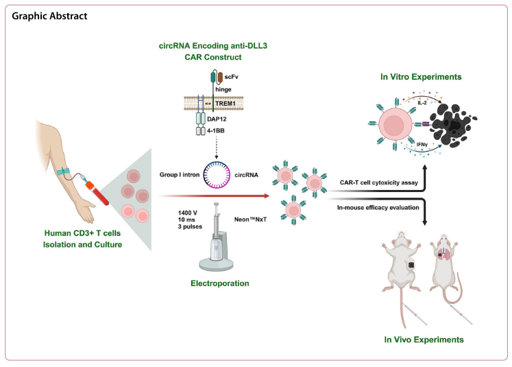 研究强调了circRNA技术与电穿孔技术的整合,成功构建CAR-T细胞。与基于mRNA的CAR-T细胞相比,基于circRNA的CAR-T表现出更强大的抗肿瘤活性。研究确立了使用circRNA电穿孔平台构建CAR-T细胞的可行性,并提出了一种靶向DLL3治疗小细胞肺癌的新治疗策略。