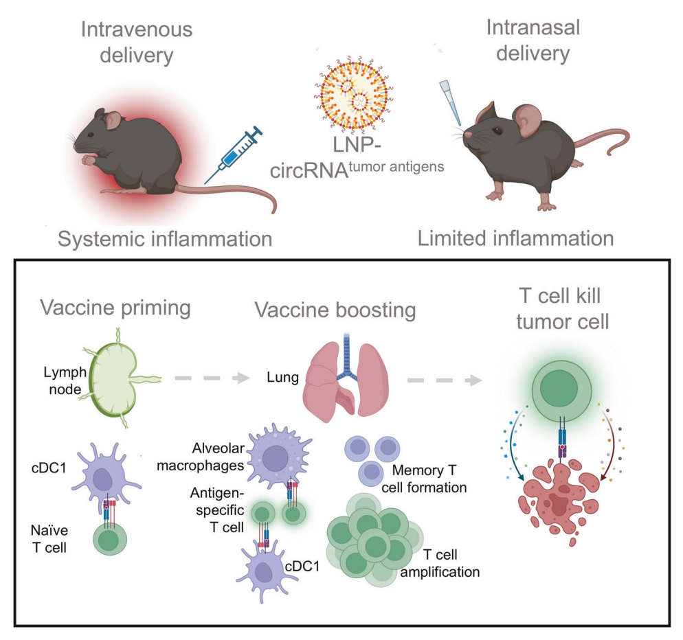 该研究利用脂质纳米颗粒(LNP)包裹的环状RNA(circRNA)来诱导局部黏膜免疫反应,从而开发了全球首个鼻内给药的circRNA癌症疫苗,在肺癌小鼠实验中,该疫苗诱导了强大的强大的抗肿瘤 T 细胞反应,精准清除肺部肿瘤,同时减轻了通常与静脉注射 mRNA疫苗相关的全身不良反应。此外,可以调节 CAR-T细胞反应,以增强对表达特定肿瘤相关抗原的肿瘤细胞的治疗效果。总的来说,鼻内RNA疫苗策略代表了一种针对黏膜恶性肿瘤开发RNA疫苗的新型且有前景的方法。