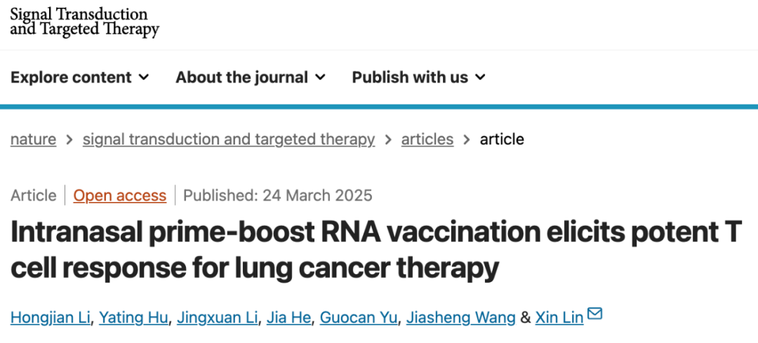 2025年3月24日,清华大学、昌平实验室林欣教授团队在 Signal Transduction and Targeted Therapy 期刊发表了题为:Intranasal prime-boost RNA vaccination elicits potent T cell response for lung cancer therapy 的研究论文。