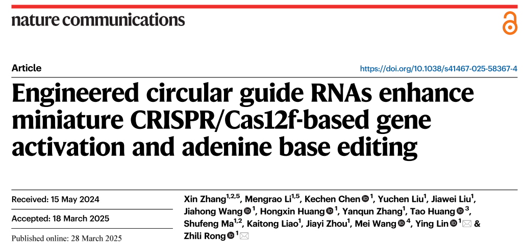 近日,南方医科大学荣知立、林瑛等人团队在nature communications上发表研究论文:Engineered circular guide RNAs enhance miniature CRISPR/Cas12f-based gene activation and adenine base editing。研究针对Un1Cas12f-ge4.0系统设计并优化了环状gRNA,显著提高了基因激活效率和腺嘌呤碱基编辑效率。