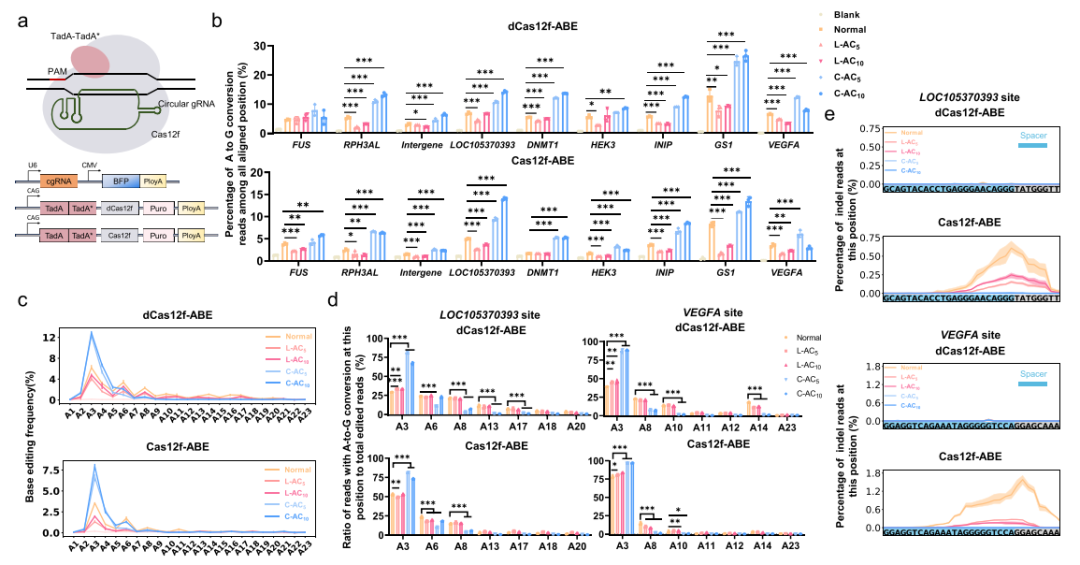 研究针对微型Un1Cas12f-ge4.0系统成功开发出新型的工程化环状gRNA(cgRNA),其稳定性和功能表现显著优于线性gRNA。cgRNA显著提高了基因的激活效率,而联合相分离进一步增强了这种作用。此外,cgRNA还可提高A-to-G碱基编辑效率,缩小编辑窗口。在成年小鼠肝脏中,cgRNA也促进了基于Cas12f的基因激活。环状gRNA的创新性设计为Cas12f系统在基因治疗中的应用开辟了新路径,特别是在遗传性疾病治疗领域有望展现出巨大的潜力。
