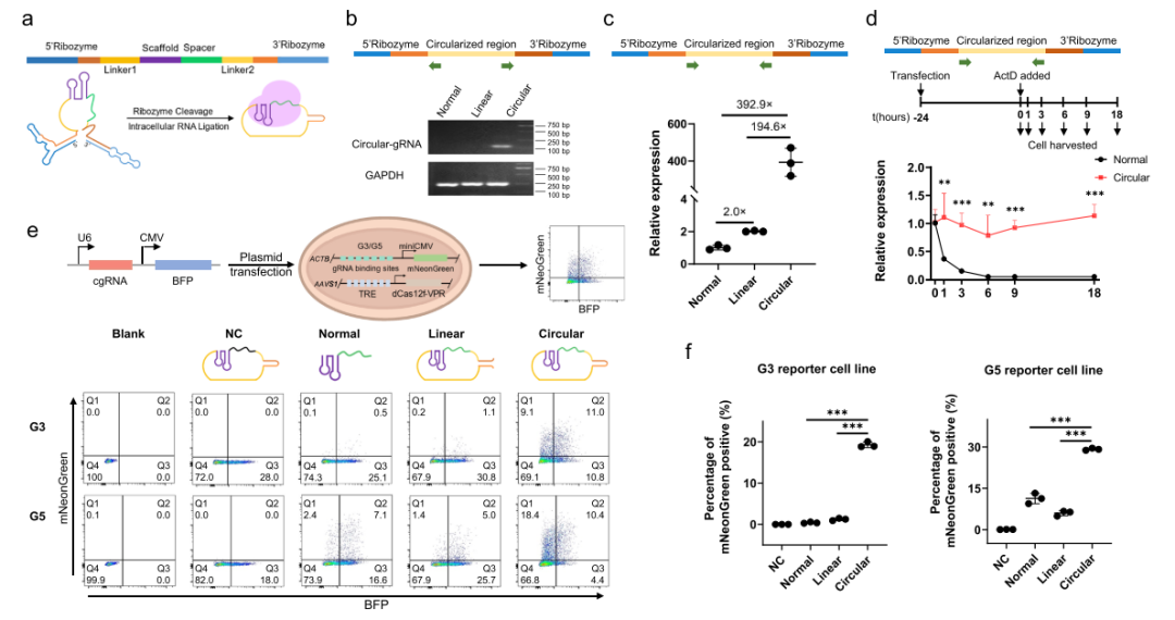 将Cas蛋白引导到特定的DNA或RNA序列的向导RNA(gRNA)对提高编辑效率至关重要。传统的gRNA是线性的,与Cas蛋白相比,其半衰期明显较短,严重限制了基因编辑效率。