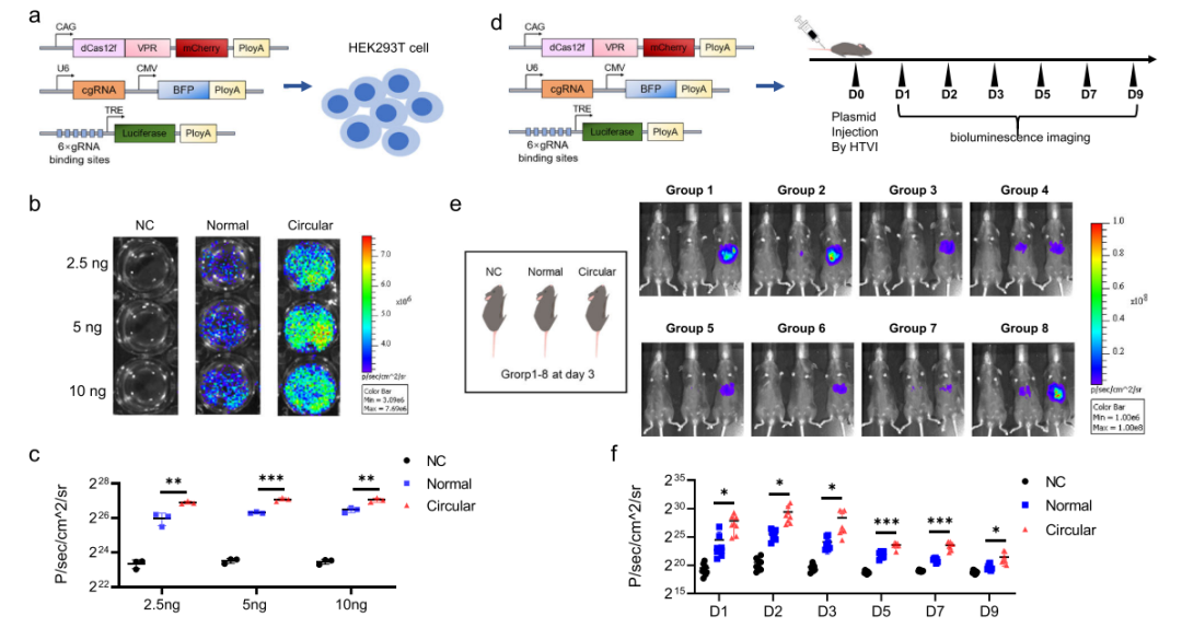 研究还验证了cgRNA可增强成年小鼠肝脏中基于Cas12f的基因激活。通过水动力尾静脉注射(HTVI)将TRE-Luciferase-polyA、dCas12f-VPR和靶向TRE启动子的gRNA质粒共递送至小鼠肝脏,cgRNA在小鼠肝脏中激活荧光素酶报告基因的效率比常规gRNA高3.3-19.3倍,表明cgRNA在活体中的高效性和稳定性。
