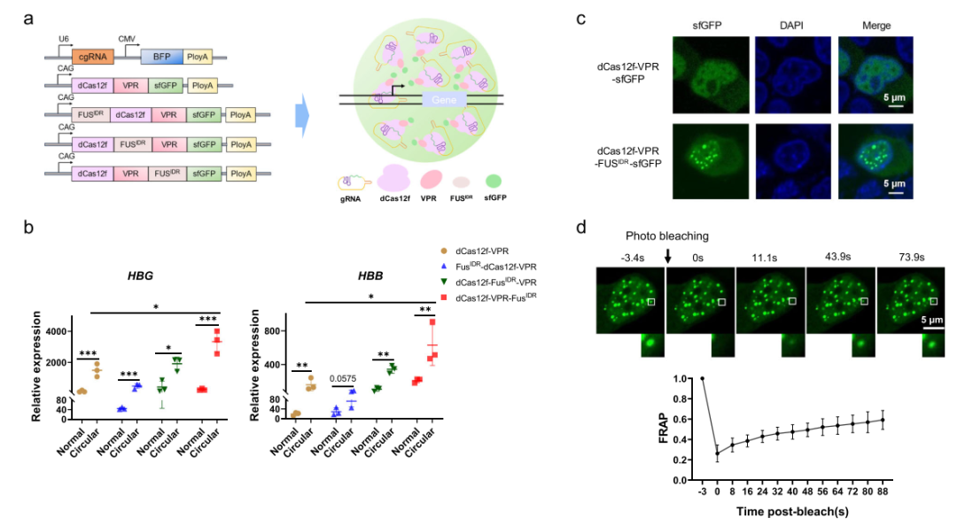 将FUS蛋白的固有无序区(IDR)融合至dCas12f-VPR,形成核内动态液滴,促进转录因子聚集。与相分离系统组合时,Cas12f/cgRNA基因激活效率进一步提高约2.3-3.9倍。