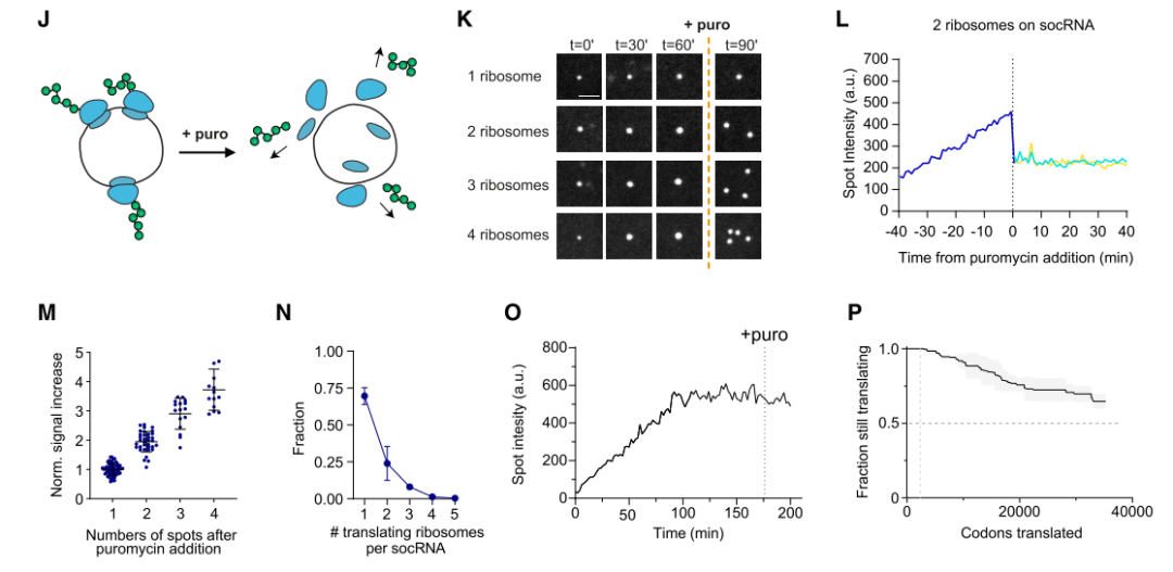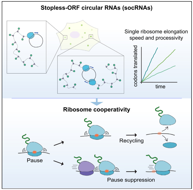 研究基于环状RNA开发了新型socRNA技术,结合高分辨率成像系统,实现了对单个核糖体翻译动力学的长时间观测,揭示了核糖体瞬时碰撞的协同作用机制。这种协作性不仅优化了翻译效率,还为细胞应对复杂翻译环境提供了适应性策略。