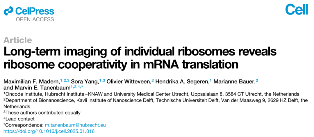 近日,荷兰乌得勒支大学医学中心的Marvin E. Tanenbaum团队在Cell期刊上发表研究论文:Long-term imaging of individual ribosomes reveals ribosome cooperativity in mRNA translation。研究开发了一种基于缺乏终止密码子环状RNA(socRNA)的成像方法,以高分辨率监测活细胞中单核糖体或多聚核糖体中单个核糖体的翻译。利用socRNA,研究揭示了在翻译过程中,核糖体可发生瞬时碰撞而产生协同作用,以确保快速有效的翻译。
