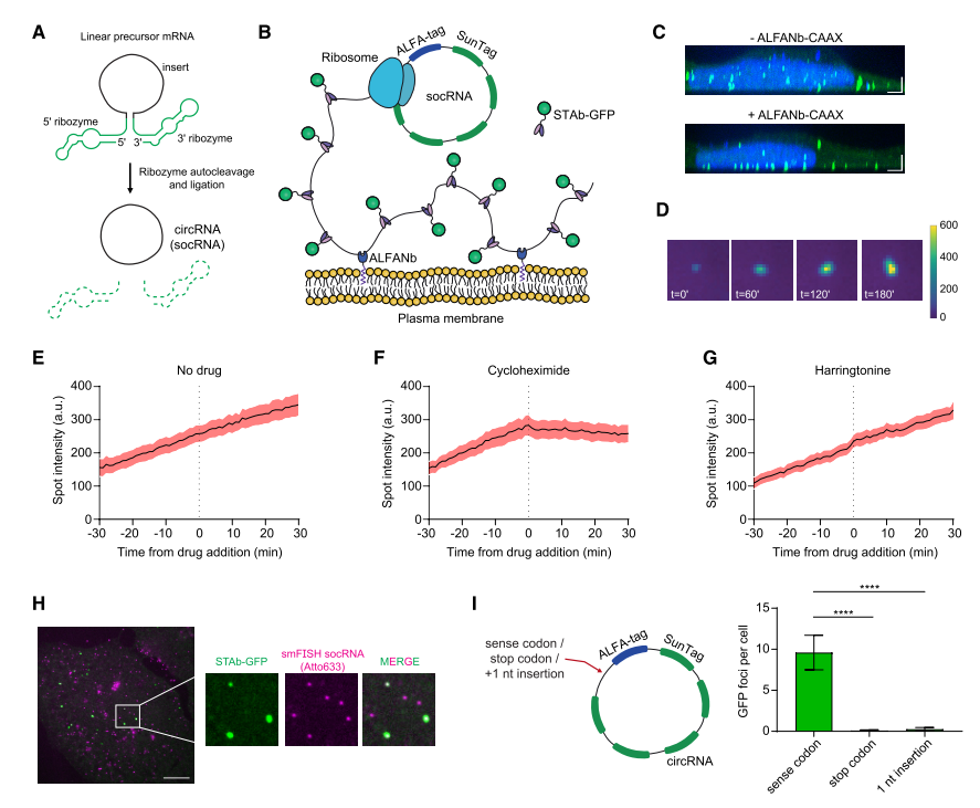 研究团队通过设计并利用Tornado系统在细胞中生成缺乏框架终止密码子的环状RNA(socRNA)。socRNA可被一个或多个核糖体翻译持续翻译数小时。该技术结合SunTag成像系统,即利用单链可变区片段(scFv)抗体轻链和重链的表位结合区域融合形成单独的多肽,这种多肽以溶解的形式表达在细胞里面,而不能正确折叠。scFv抗体可结合串联的多肽表位上,与scFv抗体融合的GFP实现信号放大和可视化。此外,还通过结合ALFA-tag将socRNA翻译复合物连接到质膜上。socRNA可以高精度测量翻译延伸率,比较一个核糖体与多个核糖体的翻译,并允许测量核糖体加工性。