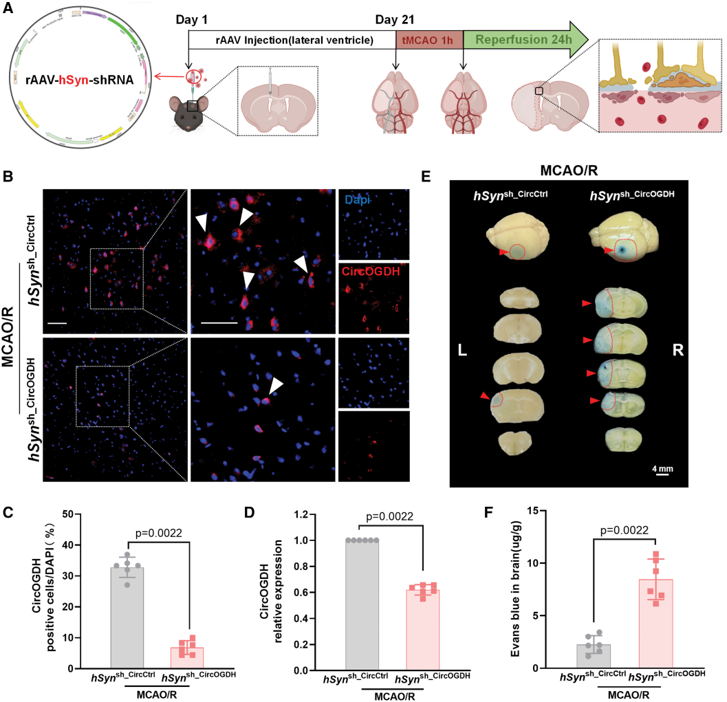 图2. MCAO/R模型小鼠神经元CircOGDH的敲低会加剧血脑屏障(BBB)的通透性。