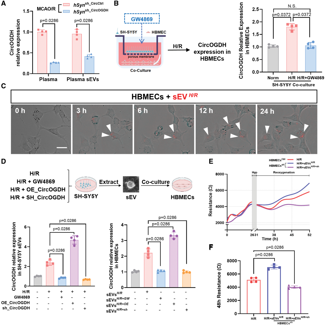 我们为了进一步解析从体内实验转向体外sEVs介导的传递机制,体外Transwell共培养实验显示,缺氧SH-SY5Y神经元释放的sEVs可将CircOGDH转运至人脑微血管内皮细胞(HBMECs),使其CircOGDH水平提升1.7倍。当使用sEVs分泌抑制剂GW4869处理后,HBMECs的CircOGDH水平无显著变化。功能实验表明,糖氧剥夺模型下富含CircOGDH的sEVs处理使HBMECs凋亡率降低,跨内皮电阻(TEER)实验验证了富含CircOGDH的sEVs可以显著减轻内皮缺氧损伤后内皮屏障的完整性和通透性的破坏,此结果明确了sEVs作为CircOGDH传递载体的关键作用。