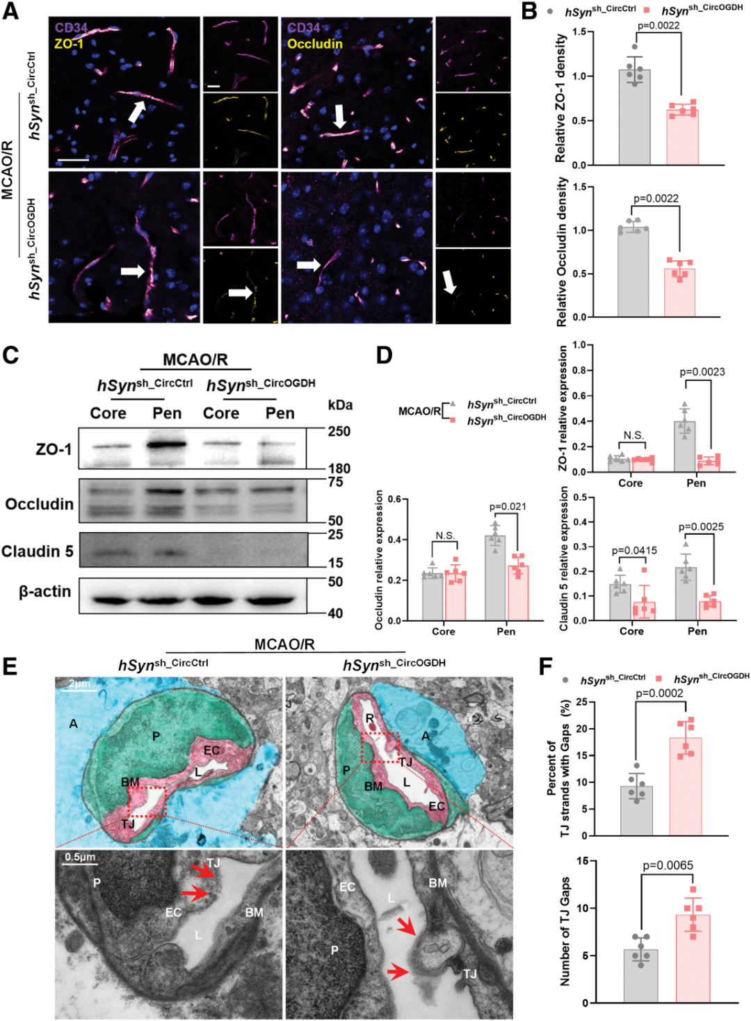 从观察到CircOGDH影响BBB通透性的现象,我们进一步解析CircOGDH对BBB完整性的分子结构基础,深入分析了紧密连接蛋白的表达变化。小鼠在缺血再灌注模型下神经元CircOGDH敲低导致ZO-1和occludin免疫荧光信号降低,进一步蛋白质印迹法检测减缺血半暗带区紧密连接蛋白ZO-1、occludin及claudin-5表达分别下降31%、15%和12%。透射电镜超微结构观察发现,敲低组21%的紧密连接存在超过10个连续性断裂(空载病毒组仅5%),且基底膜胶原结构松散。这些数据表明,CircOGDH通过维持紧密连接蛋白表达和基底膜完整性保护BBB。
