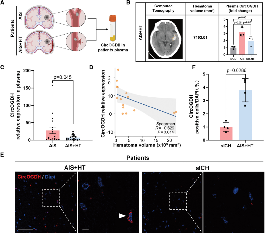 本研究纳入AIS再通治疗后18对有或无HT患者,发现有HT患者血浆CircOGDH表达水平较非HT患者显著降低,进一步检测15例HT患者CircOGDH水平与血肿体积呈显著负相关(r=−0.629, P=0.014),进一步对脑组织样本进行免疫荧光分析发现自发性脑出血患者神经元CircOGDH信号强度仅为AIS合并HT患者的约1/4,表明缺氧神经元CircOGDH的缺失与BBB破坏相关,该结果首次在临床层面证实CircOGDH可作为预测HT风险的潜在生物标志物。