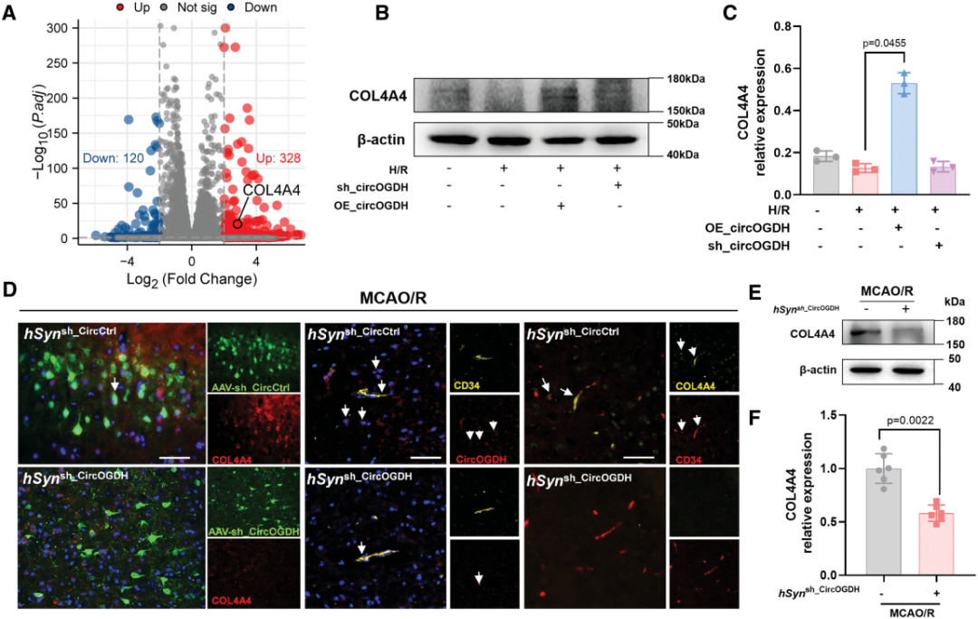 进一步研究发现,sEVs传递的CircOGDH通过调控特定靶基因发挥保护作用。RNA测序分析发现,CircOGDH过表达的HBMECs中328个基因显著上调(log2FC>2),其中IV型胶原蛋白α4链(COL4A4)表达提升6.9倍。蛋白印迹法证实,缺氧下过表达CircOGDH的HBMECs上调COL4A4蛋白水平。动物模型缺血半暗带中,免疫荧光显示神经元特异性敲低CircOGDH与CD34(内皮标记物)共定位率显著减少,COL4A4表达水平也显著下降,表明CircOGDH通过调控COL4A4维持血管基底膜稳定性。